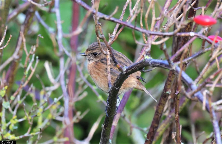 Jackdaw - 59 - South ; Meadow Pipit - 27 - South ; Chaffinch - 34 - incl 19 south ; Stonechat - 2 - Pair ; Linnet - 1+ ; Starling - 43 - 42 south, 1 west ;