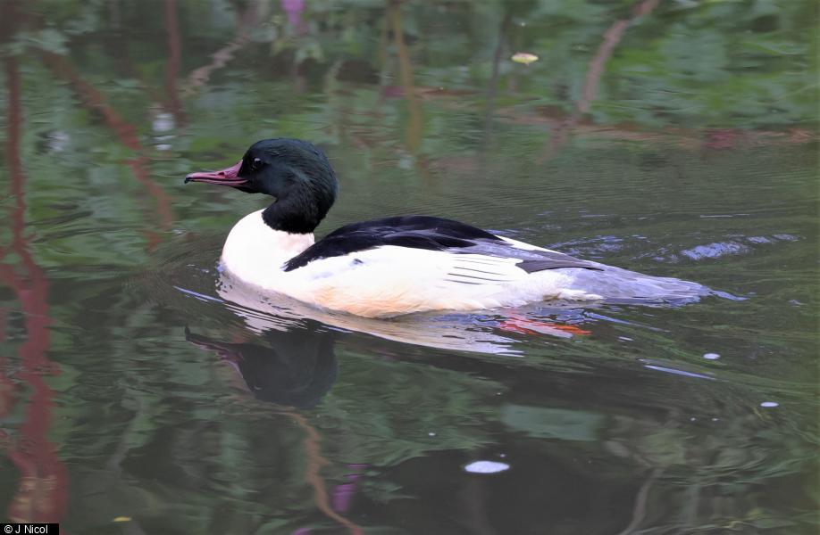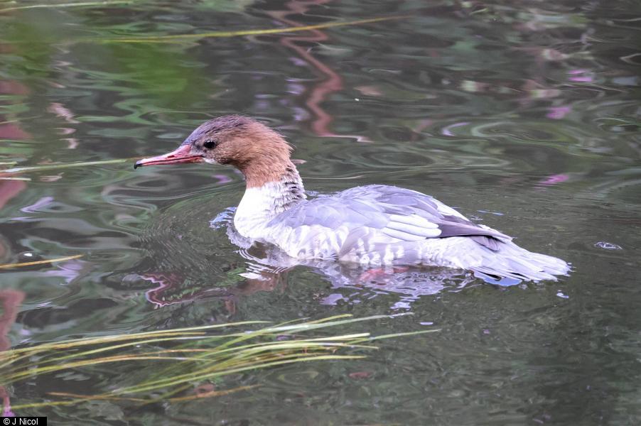 Goosander - 4 - downstream side of bridge. I drake, and 3 redheads. ; Goosander - 4 - second picture