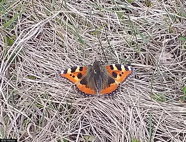 Reed Bunting - 1 - Female on bullrusheds top pond 12.00 ; Long-tailed Tit - 2 ; Blue Tit - 2 - Pair feeding with LTT's ; Robin - 2 - Singing ; Wren - 4 - Singing ; Cormorant - 1 - Over ; Canada Goose - 3 - River ; 324 - 1 - Small Tortoiseshell.