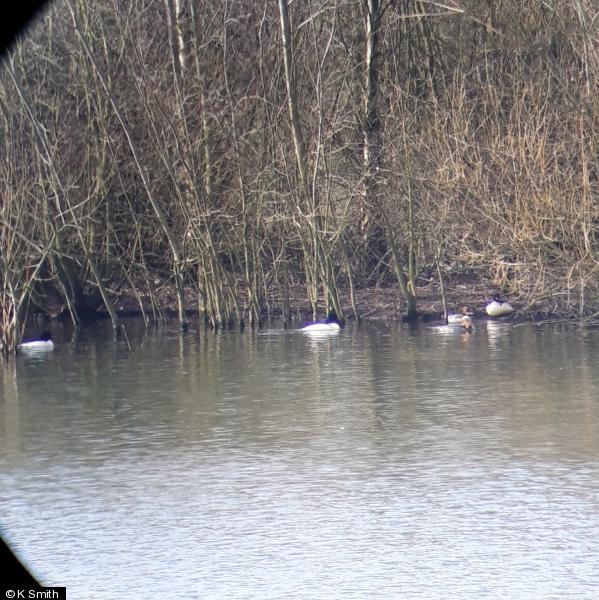 Goosander - 5 - 3 male, 2 female ; Goldeneye - 6 - 2 male, 4 female ; 320 - 2 - 1 male, 1 female ; Chiffchaff - 1+ - heard in numerous locations so likely several