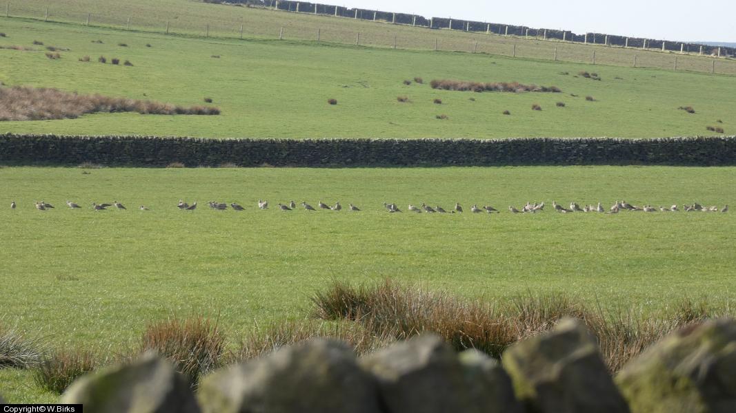 Curlew - c80 - approx 60 feeding in rushy, sheep-grazed pasture plus another flock of about 20 flew in. ; Starling - c20 - feeding in pasture alongside Curlews ; Carrion Crow - 1 ; Black-headed Gull - 1 - feeding in pasture with Curlews