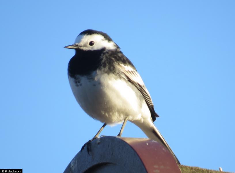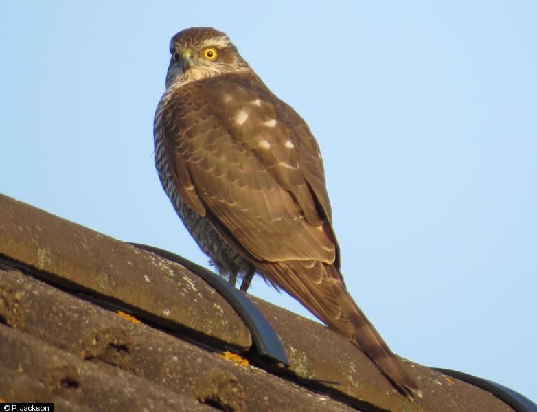 Sparrowhawk - 1 - Taking sun on neighbours roof. ; Pied Wagtail - 1 - In observers garden.