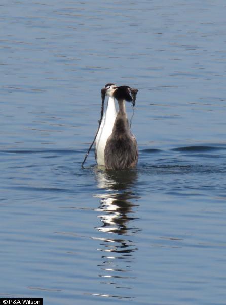 Great Crested Grebe - 4 - The dance pt3 ; Little Grebe - 1 ; Great Black-backed Gull - 2 ; Gadwall - 3 ; 320 - 1 - Male ; Wigeon - 10 ; Lapwing - 2 ; Pochard - 3 - Males ; Pied Wagtail - 2 ; Goose sp - 5 - Abandoned eggs on top of island ; Oystercatcher - 3 - Copulation observed on small lake island