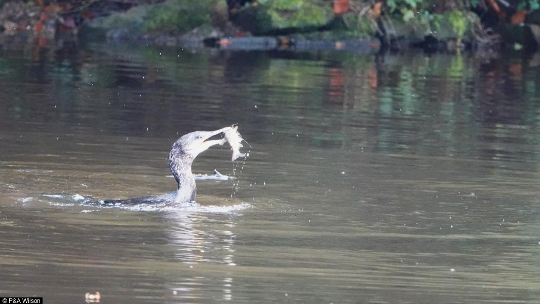 Cormorant - 2 - One had a phenomenally high success rate of dives to fish caught - poor photo but shows size of fish well ; Moorhen - 2+