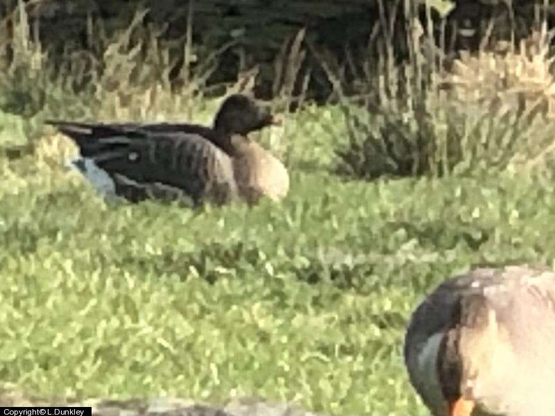 319 - 1 - 1 bird perched in tree to north of entrance road ; Goose sp - 1 - hybrid 'thing' with Canada Geese