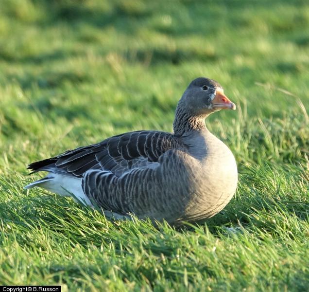 - 1 - imm with 6 Greylags ; Greylag Goose - 1 - 'white-fronted' bird, but note thick orange bill with pale tip (cf the White-front).
