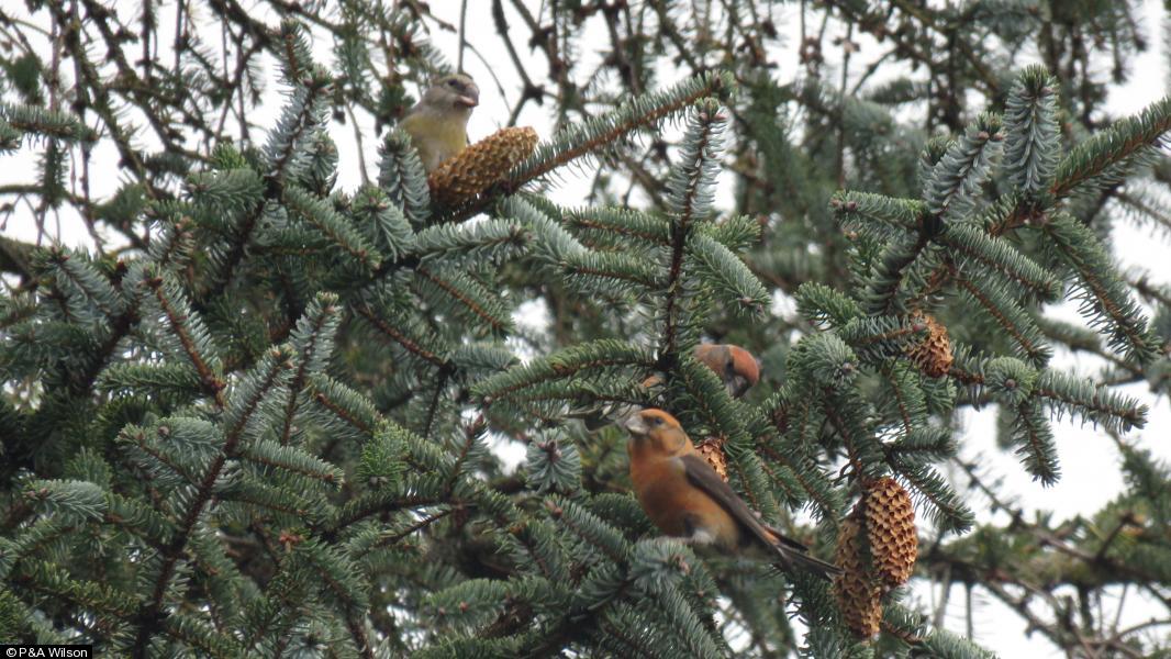 Crossbill - 12+ - M&F feeding in trees on main rd adj to conduit ; Crossbill - 12+ - Male ; Crossbill - 12+ - Another male ; Tufted Duck - 9 - M&F ; Long-tailed Tit - 4+ ; Black-headed Gull - 15