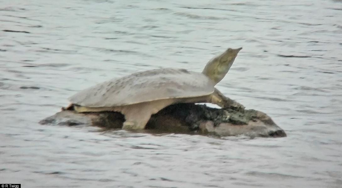 324 - 1 - Chinese Soft Shelled Turtle. Sat on rock in reserve Lake.
