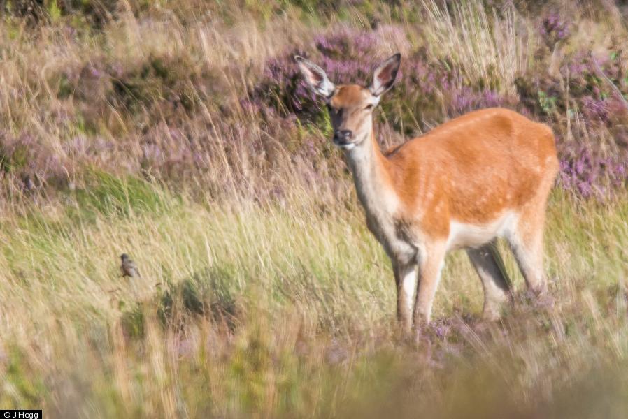 Long-tailed Tit - 10 ; Wheatear - 1 ; Curlew - 3 ; 324 - 3 - Red Deer - 2 adults and fawn