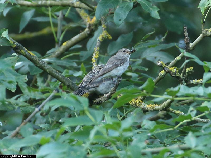 - 1 - with tit flock ; Spotted Flycatcher - 1 - adult feeding two recently fledged juvs ; Raven - 2 ; Goldcrest - 1 ; Long-tailed Tit - 10+ ; Coal Tit - 3 ; Chiffchaff - 3