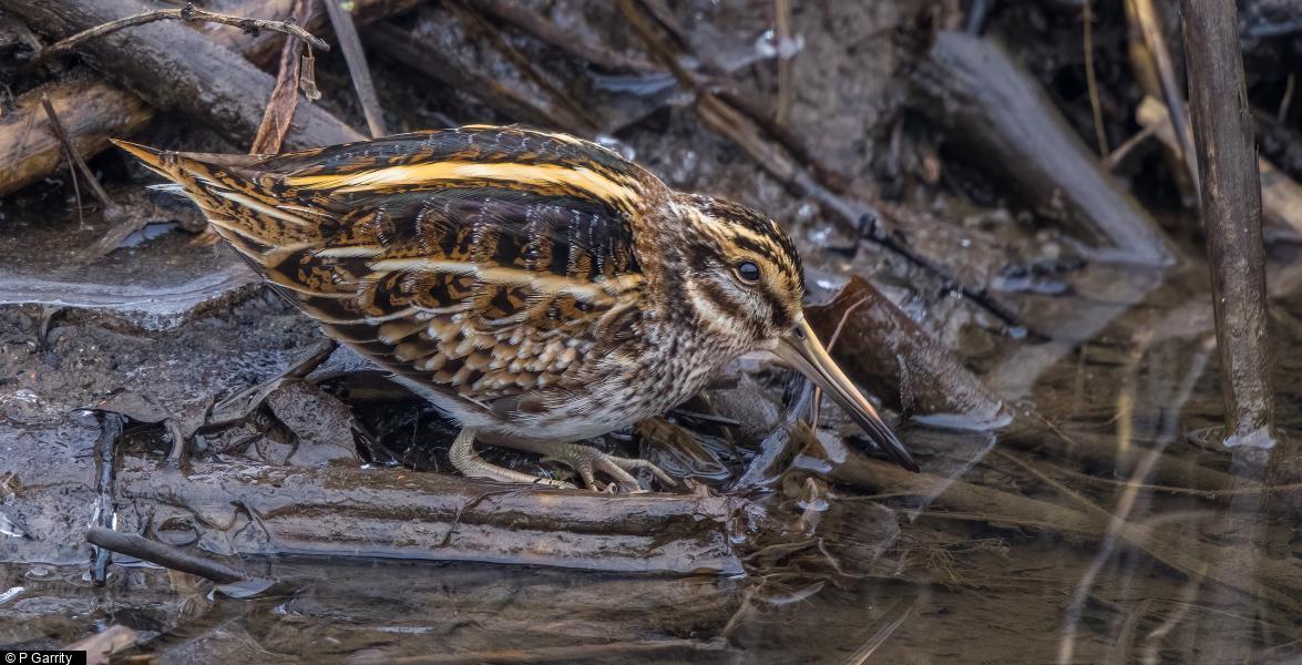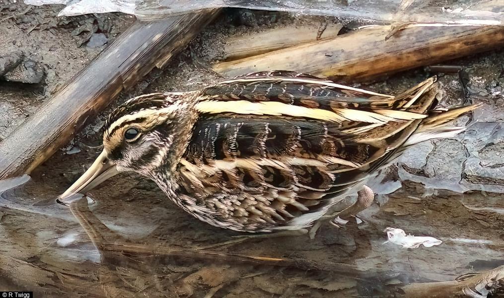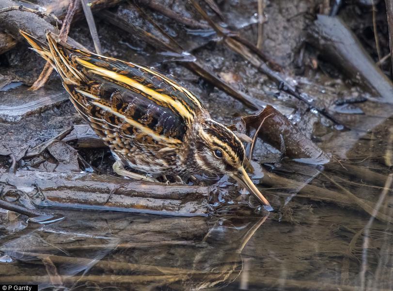 Jack Snipe - 1 - on banks of Rother ; Jack Snipe - 1 - another photo ; Snipe - 11 - 2 on feeder stream. ; Jack Snipe - 1 ; Water Rail - 2 - one on feeder stream, one on river.