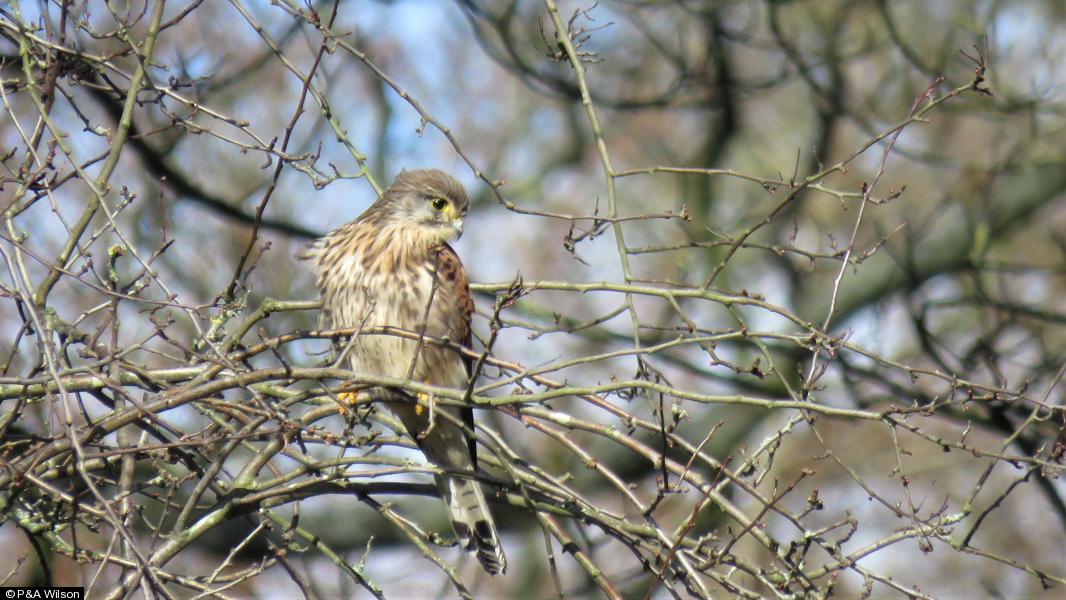 Common Buzzard - 1 - calling from tree; disturbed by dog walker ;