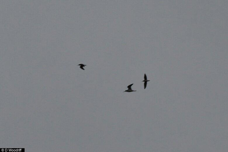 - 3 - Seen on arrival 06:15, all 3 rose calling and circled site with Greenshank. 2 left but one returned and continued to feed until it too left ESE at 07:00 ;