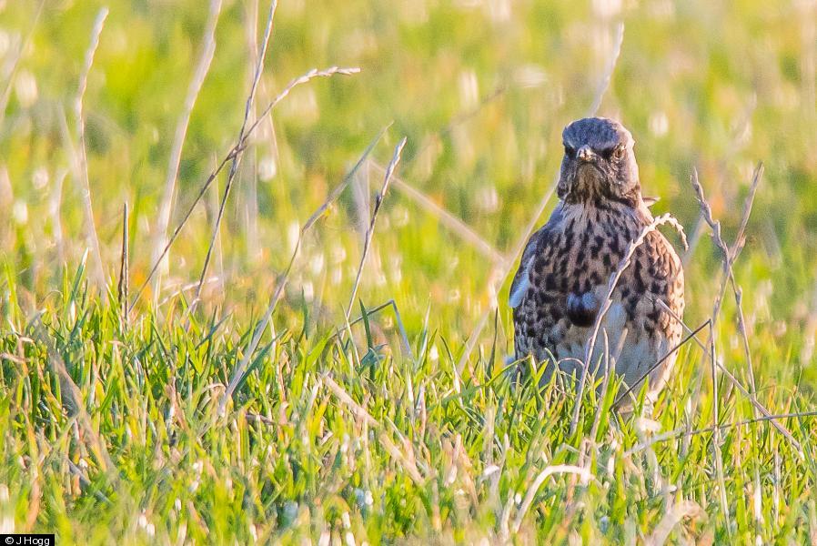Fieldfare - 47 - feeding in sheep field at dusk. ; Wren - 2 - alarm calling from wall bottom.