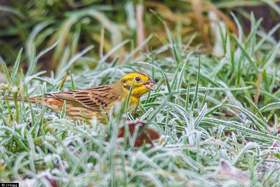 Yellowhammer - 2 ; Great Tit - 8 ; Raven - 1 ; Chaffinch - 8 ; Coal Tit - 6 ; Blue Tit - 12 ; Yellowhammer - 1 - Male in splendid plumage ; Dunnock - 1 ; Blackcap - 1 ; Nuthatch - 2