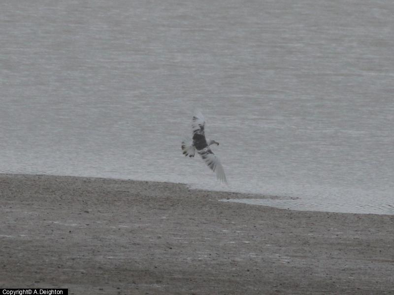 - 1 - arrived calling at 16:15 in rain, and left W at 17:00. ; Whitethroat - 1 ; Blackcap - 2 ; Coot - 1 ; Moorhen - 1 ; Willow Warbler - 1 ; Chiffchaff - 4 ; Lesser Black-backed Gull - 125 - inc striking 3cy leucistic bird. ; Sparrowhawk - 1 - 'rain bathing' on the mud ; Yellow Wagtail - 1 ; Greylag Goose - 6 ; Grey Heron - 1