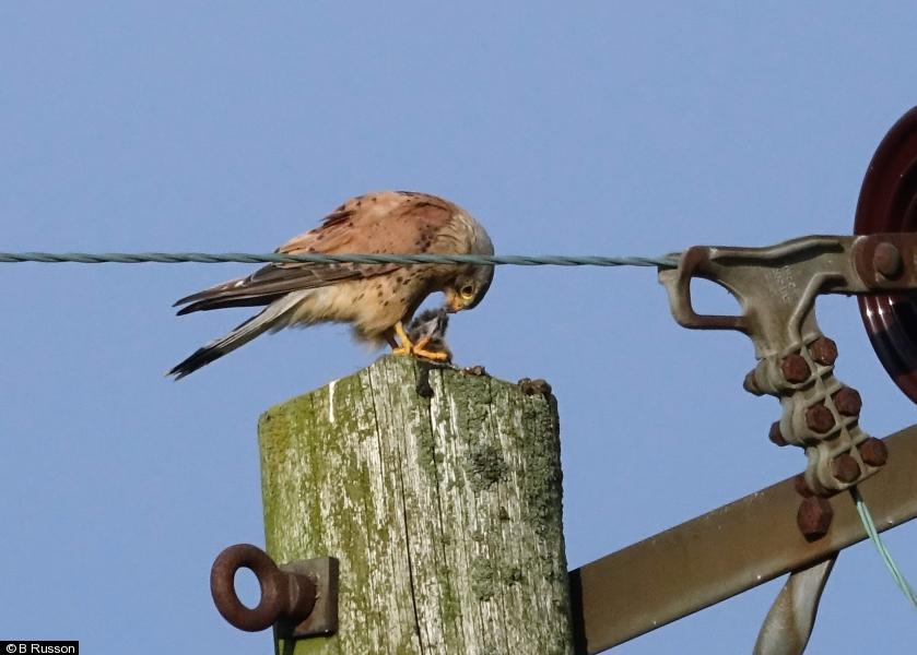 Kestrel - 1 - on telegraph post eating prey which appeared to be a rat