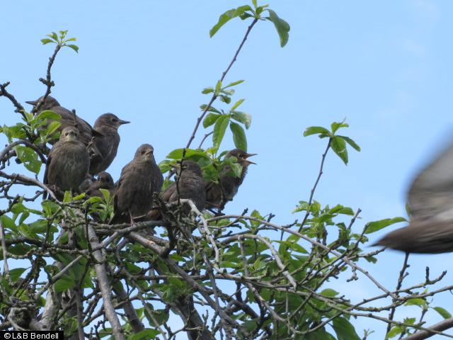 Starling - 20+ - Fledged starlings being fed by a few adults constantly during last 4 days. ; Great Tit - 2 - Adults visiting nest in garden shed to feed caterpillars to young. Bentley Road.