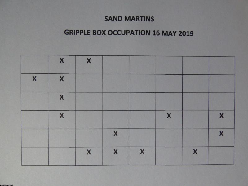 Wren - 8 - singing ; Mallard - 10+ - incl. f + 4 chicks ; Carrion Crow - 4 ; Goldfinch - 10+ ; Blackbird - 8 - incl 2 prs ; Magpie - 6 ; Great Tit - 2 ; Willow Warbler - 2 - singing ; Blackcap - 4 - singing ; Greenfinch - 5+ ; Sand Martin - 30+ - at least 14 holes occupied in Gripple box ; Sand Martin - 30+ - many collecting dried moss from waste land near Gripple ; Garden Warbler - 1 - challenging nearby Song Thrush in duet. (Record shot) ; Song Thrush - 1 - singing ; Woodpigeon - 4 ; 321 - 1 ; Moorhen - 4 ; Black-headed Gull - 1 - immature ; Grey Wagtail - 1 - m ; Robin - 2 ; Mistle Thrush - 1 - singing ; 319 - 1 - in waste ground near Gripple. (Record shot) ; Chiffchaff - 1 - singing