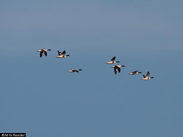 Shelduck - 7 - Early morning then east ; Dunlin - 3 ; Ringed Plover - 3 ; Shelduck - 7 ; Tawny Owl - 1 - Calling adjacent to river at 17:50 ; Great Crested Grebe - 29