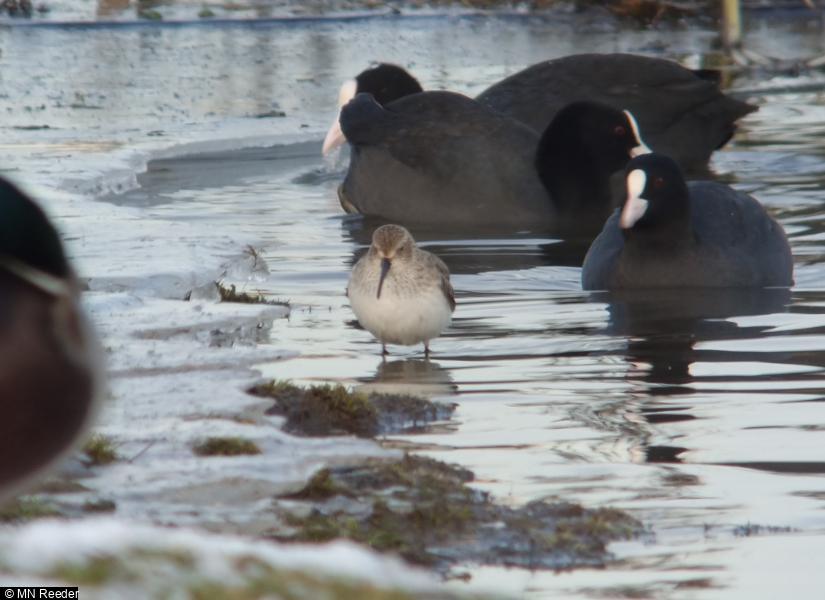 Tufted Duck - 100+ ; Pochard - 16 ; Goldeneye - 4 ; Shoveler - 9 ; Wigeon - 4 ; Gadwall - 90+ ; Goosander - 3 - west ; Mute Swan - 28 ; Golden Plover - 1 ; Lapwing - 80+ ; Snipe - 3 - One under willows 2 in stream ; Water Rail - 1 ; Great Crested Grebe - 16 ; Little Grebe - 4 ; Cormorant - 14 ; Grey Heron - 4 ; Kestrel - 3 ; Peregrine - 1 - Flew east 11:10 ; Nuthatch - 1 - caravan park - afternoon) ;