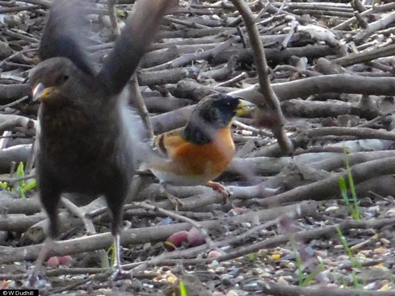 Carrion Crow - 1+ ; Blackbird - 1+ ; Blue Tit - 1+ ; Chiffchaff - 1 - singing ; Magpie - 2+ ; Robin - c4 - singing ; Goldfinch - c10 ; Woodpigeon - 3+ ; Mistle Thrush - 1+ ; Song Thrush - 1 ; Wren - 1+ - singing ; Carrion Crow - c100 - feeding in fields ; Jackdaw - c20 - feeding in fields ; Long-tailed Tit - 1= ; Skylark - 2+ - singing males on fields near former airstrip ; Meadow Pipit - 2+ - territorial display in fields near airstrip ; Starling - c15 ; Herring Gull - 2+ - on former airstrip ; Lesser Black-backed Gull - 2+ ; Mallard - 2+ - in pool in woodland by golf course