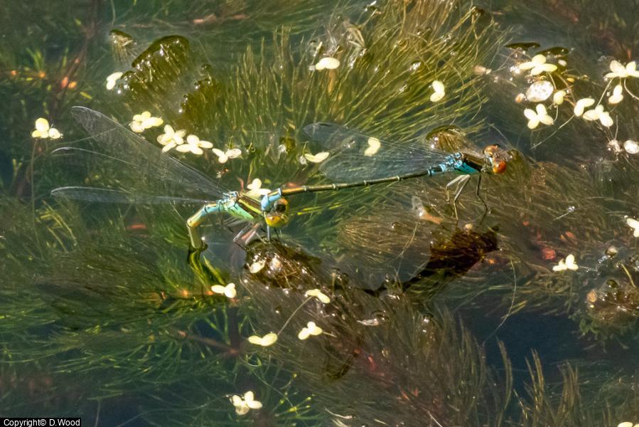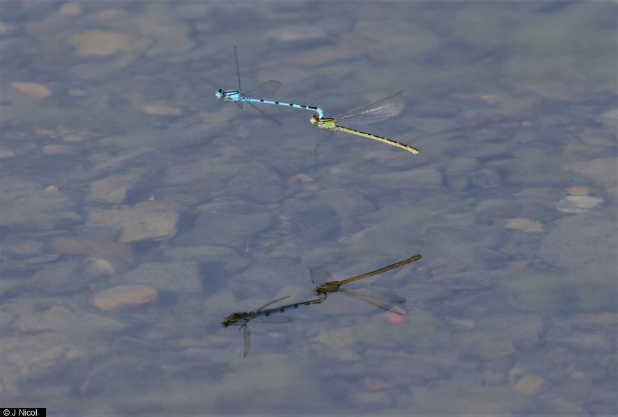 Great Crested Grebe - 5+ - pair with 2 well-grown juvs S end, displaying pair middle of res and one at N end ; Mute Swan - 4+ - pair with 4 well-grown cygnets at S end and pair at N end ; Tufted Duck - 1 - eclipse male ; Coot - 20+ - including several fledged juvs ; Black-headed Gull - 80 - feeding overhead on flying ants ; 324 - 8 - Small Red-eyed Damselflies, including ovipositing pairs