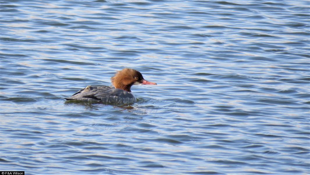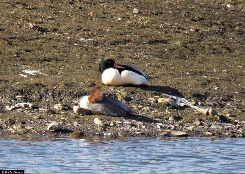 Black-headed Gull - 300+ ; Goldeneye - 3 - M&2F ; Great Crested Grebe - 5 ; Goosander - 4 - M&3F ; Goosander - 4 ; Tufted Duck - 20+ - M&F ; Skylark - 5+ ; Reed Bunting - 1 - Male ; 320 - 10+ ; Wigeon - 23 ; Oystercatcher - 2 - Seen mating ; Pochard - 15+ ; Lapwing - 45+ ; Redshank - 5 ; Gadwall - 10+ ; Cormorant - 1 ; Pied Wagtail - 1