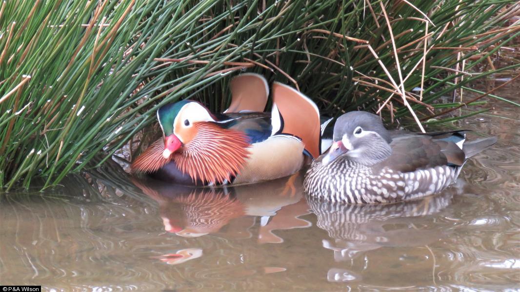 Mandarin - 4 - 2m+2f ; 320 - 3 - m+2f ; Siskin - 6 - M&F in adjacent woods ; Treecreeper - 1 - In adjacent woods ; Kestrel - 1 - Adjacent field ; Mandarin - 4