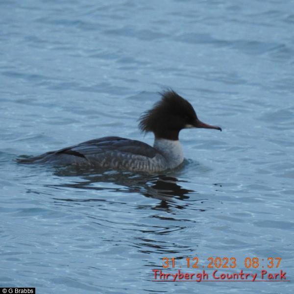 Tufted Duck - 8 ; Pochard - 5 - 4m; 1f ; Coot - 22 ; Black-headed Gull - c100 ; Gadwall - 12 ; Mallard - 10 - 5prs ; Moorhen - 2 ; Great Crested Grebe - 1 ; 320 - 1+ - calling from willows on W side ; Goosander - 4 - 3m; 1f, flew in from direction of Waverley Lakes ; Shoveler - 6 - 3m; 3f ; Mute Swan - 2 - 'resident' adult pair ; Grey Heron - 1 - imm