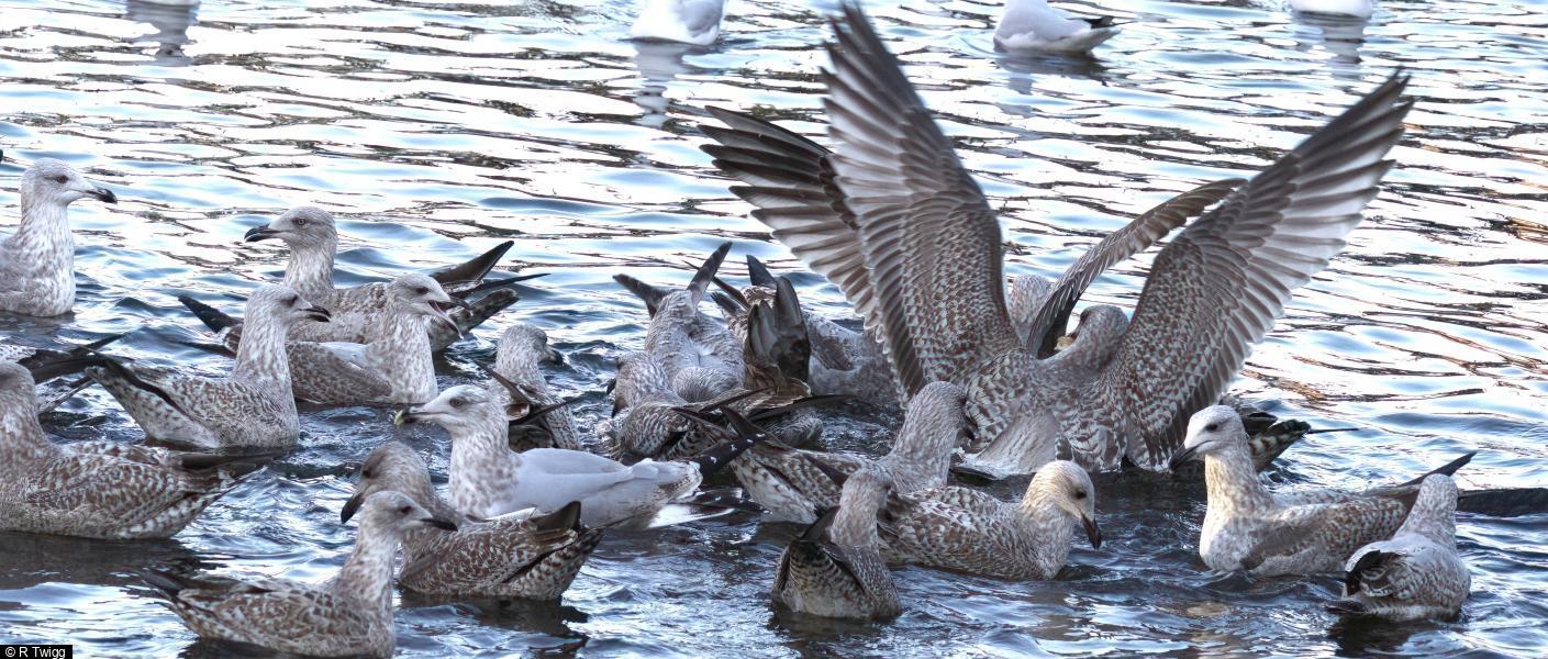 - 1 - 1st winter unringed but not the regular bird. Grey feathers in the right wing. ; Herring Gull - 177+ - 100s more in and out. ; Common Gull - 1 - adult on Wards roof. ; Kingfisher - 1