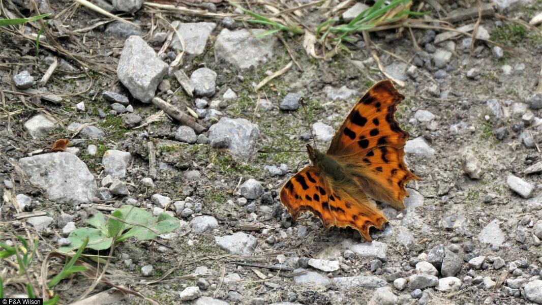 Sand Martin - 6 - 2 seen entering nest site with food near the canal Hub ; Swift - 5 ; Swallow - 1 ; 324 - 1 - Comma butterfly