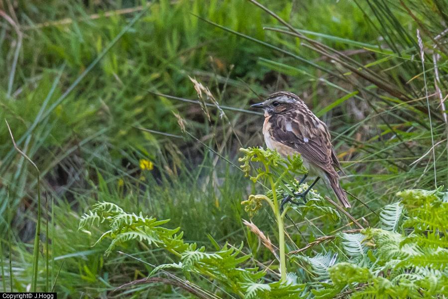 Whinchat - 1 - male in suitable breeding habitat ; Curlew - 1 - alarming - presumably young present ; Whitethroat - 1 - singing ; Meadow Pipit - 11 ; Skylark - 2 ; Sparrowhawk - 1 - male carrying prey into wood