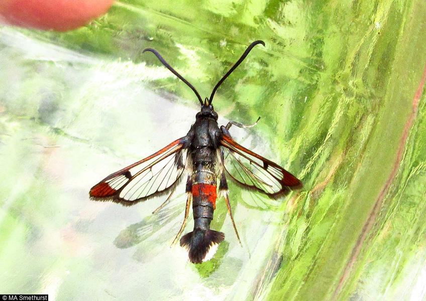 324 - 1 - Red-tipped Clearwing in willows by main flattened overflow above the bridge. ;