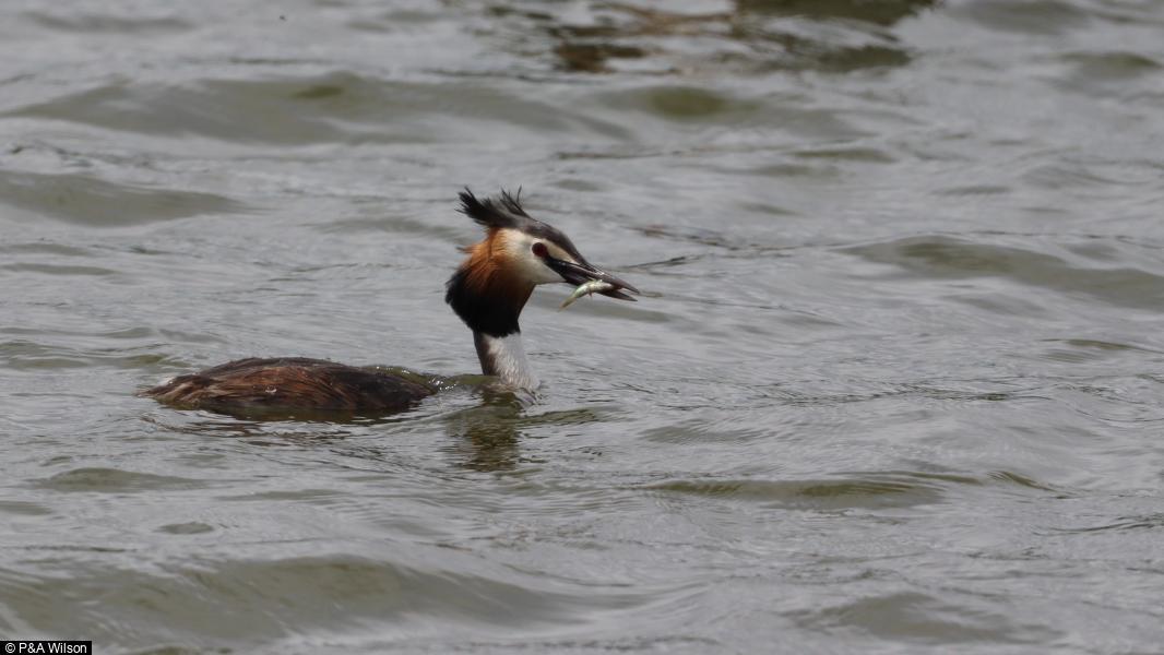 Great Crested Grebe - 4 ; Canada Goose - 4 - 2 pairs + 6 young ; House Sparrow - 6 ; Garden Warbler - 2 - male singing + other bird alarming ; Blackcap - 2 - pair - male alarming + female wing shuffling - presumed nest site