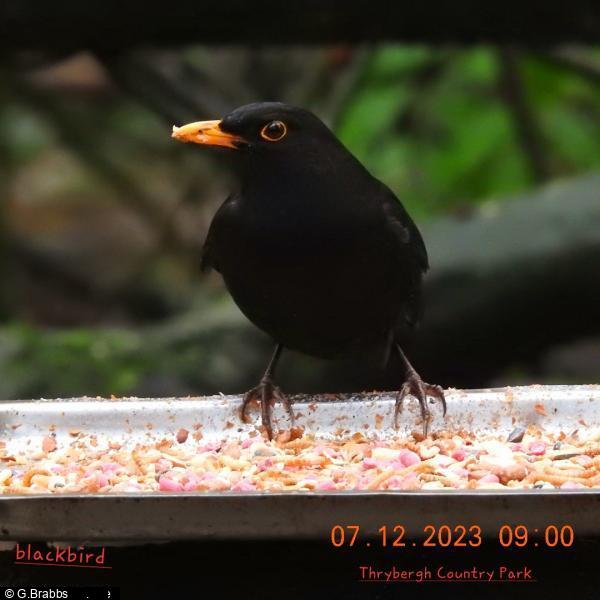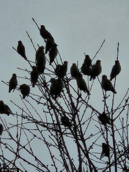 - 4+ - in holly tree, in a mixed flock with Blackbirds ; Blackbird - 3+ ; Blue Tit - 3+ ; Great Tit - 1 ; Goldfinch - 3 ; Black-headed Gull - 35 ; Herring Gull - 1 ; Mallard - 14 ; Coot - 2 ; Moorhen - 3 ; Woodpigeon - 3 - juvenile ; Cormorant - 1 - immature bird on pond
