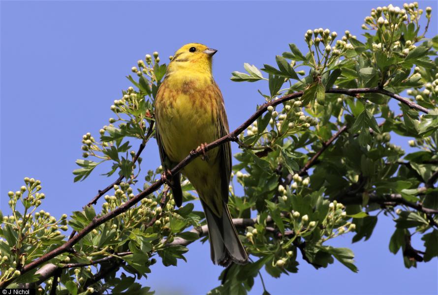 Chiffchaff - 6 - singing ; Long-tailed Tit - 6+ ; Blackcap - 4 - 2 singing ; Willow Warbler - 5 - 4 singing ; Song Thrush - 1 - singing ; Yellowhammer - 4 - 3 singing ; Red-legged Partridge - 8 ; Bullfinch - 1 ; Kestrel - 1 - female, hunting ; Whitethroat - 1 - singing ; Chaffinch - 1 - singing ; Blackbird - breeding confirmed - discarded eggshells ; Woodpigeon - breeding probable - inc bird carrying nest material