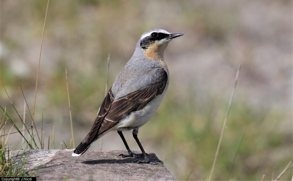 Curlew - 6 - 3 pairs ; Canada Goose - 6 - inc a pair with at least one young ; Mallard - 2 - males ; Reed Bunting - 2 - pairs in softrush ; Wheatear - 1 - showing characteristics of Greenland Wheatear ; Kestrel - 1 - male ; Meadow Pipit - 34 ; Skylark - 4