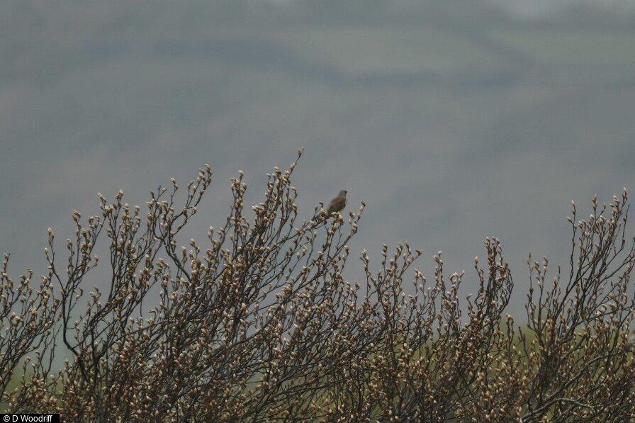Great Spotted Woodpecker - 1 - over from Bell Pits ; Linnet - 5 - inc f with nest material ; Chaffinch - 1 - singing ; Greenfinch - 3+ ; Kestrel - 1 - female ; Blackcap - 1 - singing ; Whitethroat - 1 - singing ; Willow Warbler - 2 - singing ; Swallow - 2 - over