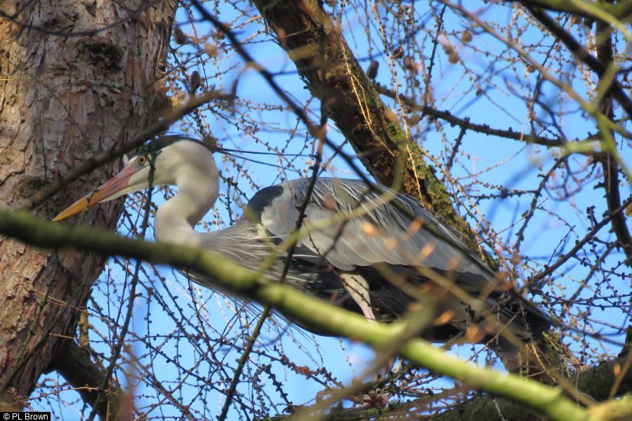 Grey Heron - 7+ - Back on territory. Much calling, interaction and carrying twigs to nest platforms. ; Stock Dove - 4+ - Two singing