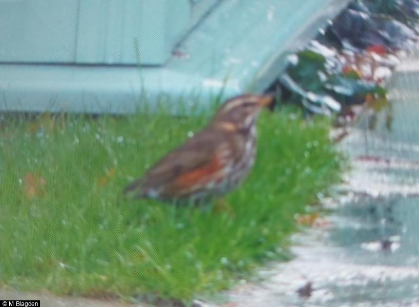 - 5 - feeding in Hawthorns ; Blackbird - 12 - loose flock, in Hawthorns ; Bullfinch - 1 - female ; Song Thrush - 1 ; Fieldfare - 2 - feeding on fruit in apple tree