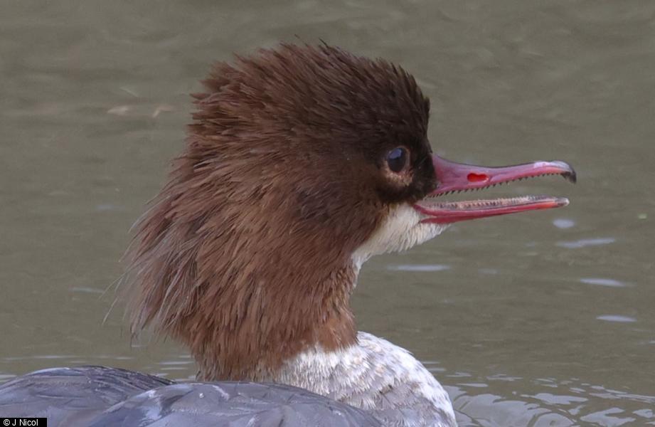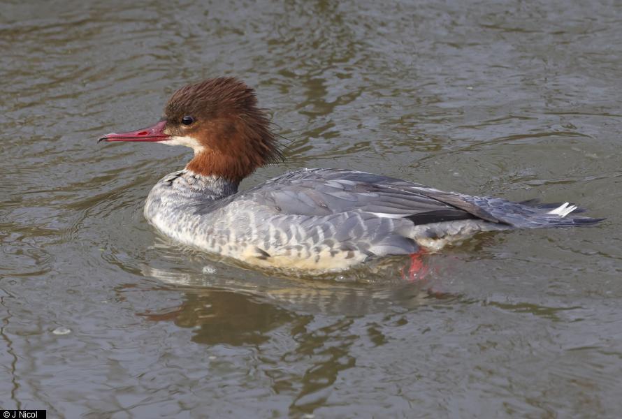 - 1 - Single bird still feeding alongside Canada Geese. ; Goosander - 1 - Single redhead on river. ; Goosander - 1