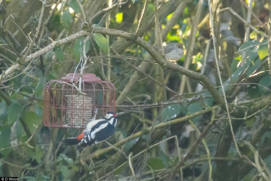 - 2 - males at feeders ; Blackcap - 1 - female feeding on sunflower hearts and apples ; Great Spotted Woodpecker - 1 - male at feeders