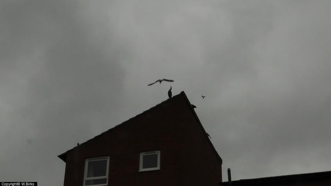 Peregrine - 1 - adult on rooftop of before disappearing & returning soon after with FP which it carried to chimney to pluck. Left to N part of complex with prey. ; Common Buzzard - 1 - over N part of site chased by crow