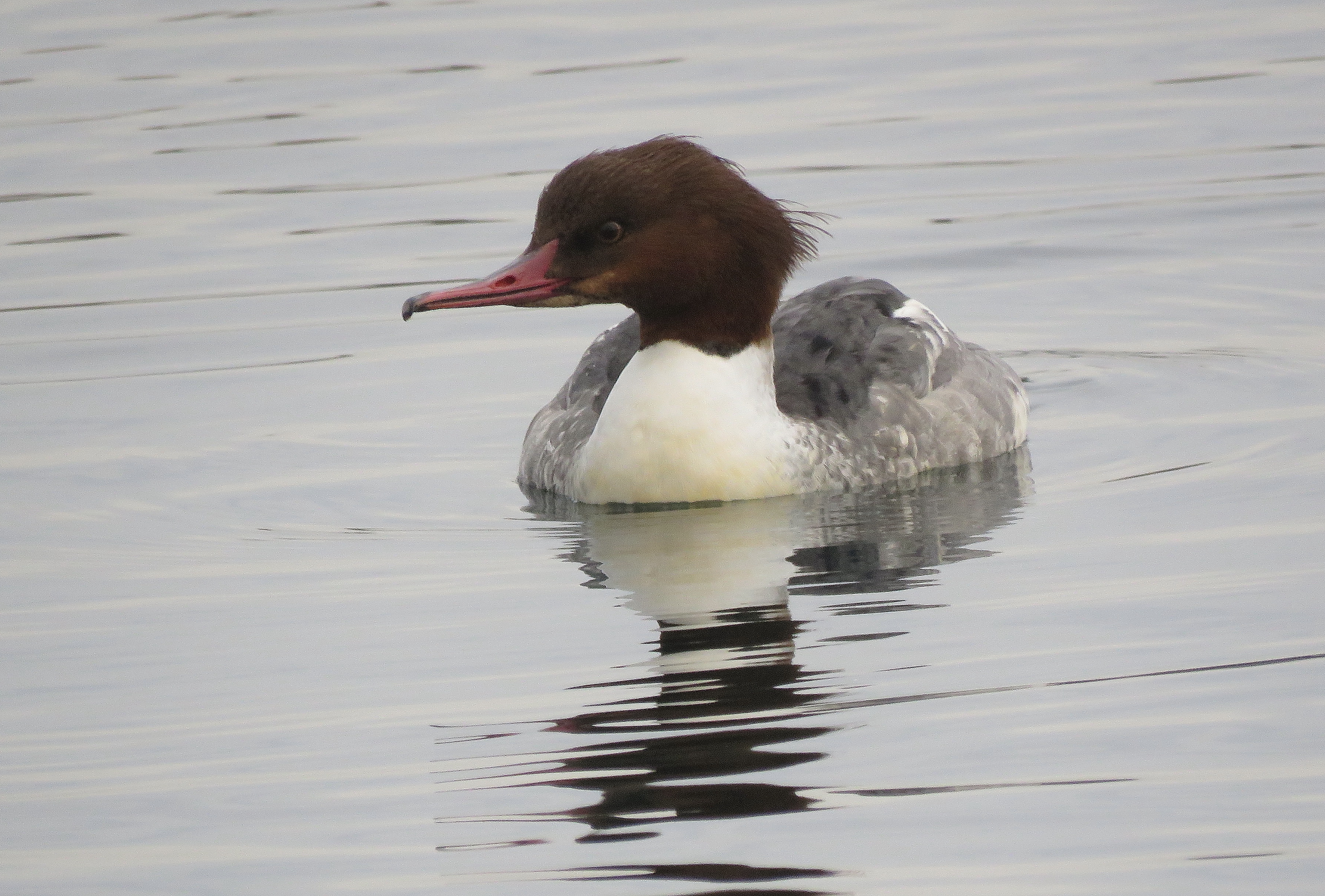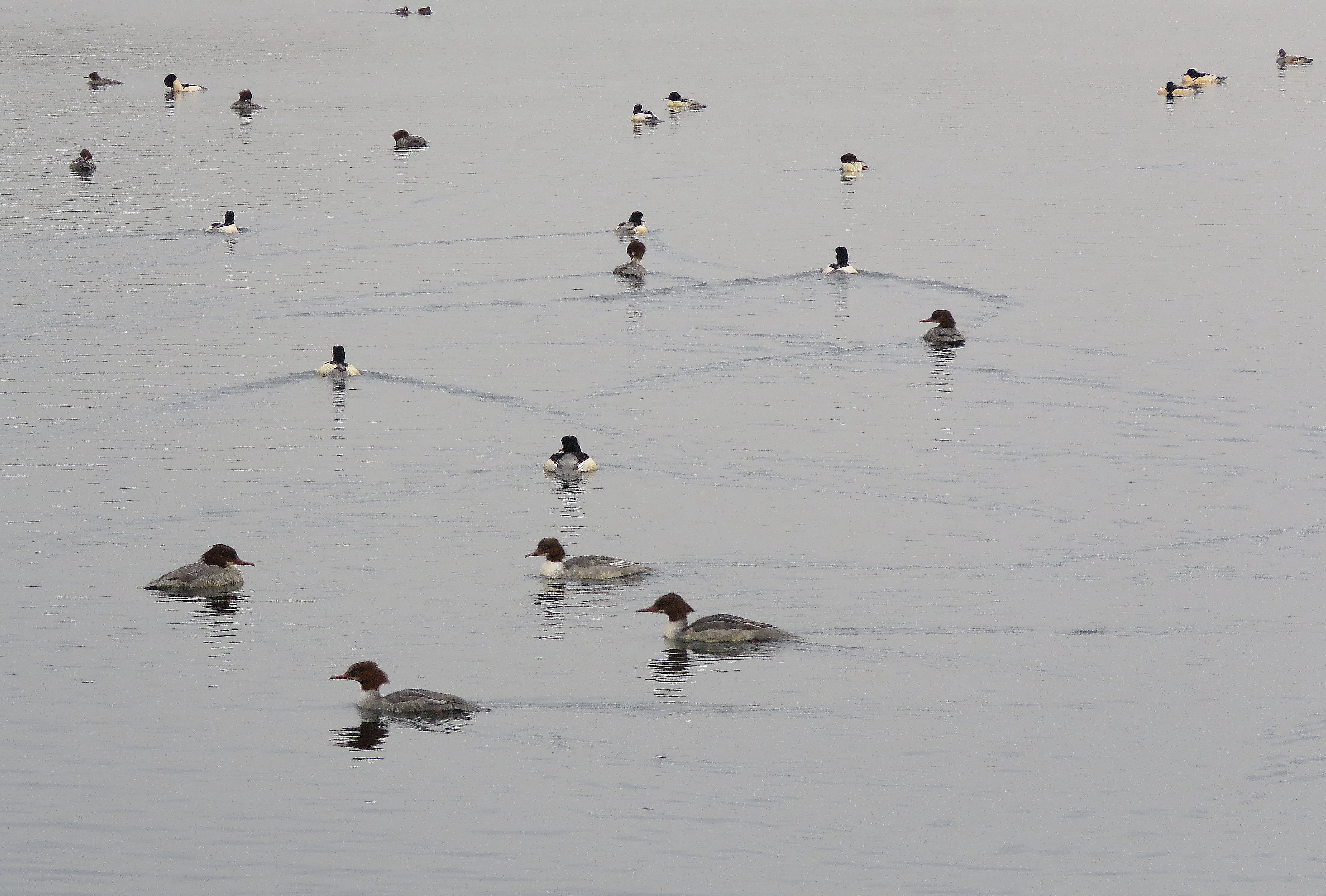 - 212 - NW at 0850 ; Canada Goose - 325 ; Grey Heron - 2 ; Cormorant - 28 ; Little Egret - 1 ; Great Crested Grebe - 13 ; Little Grebe - 2 ; Mallard - 330 ; Gadwall - 18 ; Wigeon - 174 ; 320 - 16 ; Tufted Duck - 38 ; Pochard - 17 ; Goldeneye - 9 ; Goosander - 47 ; Goosander - 47 - Part of the flock of 35 on the Main Lake ; Lapwing - 52 ; Herring Gull - 27 ; Lesser Black-backed Gull - 4 ; Black-headed Gull - 125+ ; Coot - 210 ; Moorhen - 27 ; Siskin - 35+ - Feeding on Alders ; Goldfinch - 45+ - single flock
