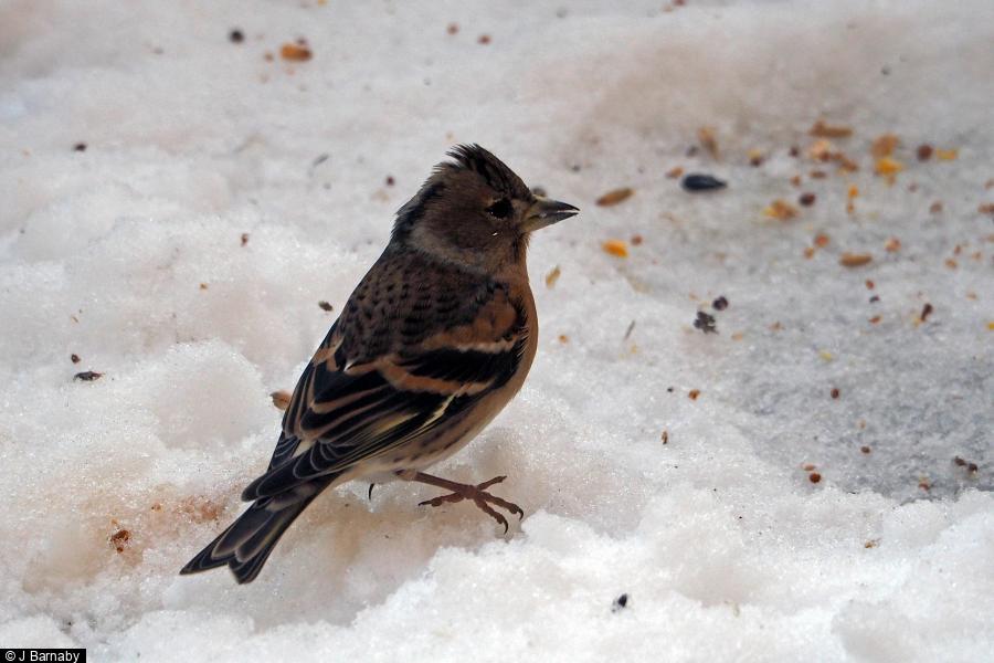 - 20 - feeding on holly and hawthorn berries amid snow ; Song Thrush - 2 - feeding on berries with Redwings - unusual at this time of year ; Mistle Thrush - 1 - feeding on berries - unusual in garden ; Blackbird - 8 - increase in numbers with snow ; Wren - 1 ; Greenfinch - 5 - at feeders ; House Sparrow - 6 - at feeders ; Chaffinch - 6 - around feeders ; Goldfinch - 3 - at feeders ; Great Tit - 2 ; Blue Tit - 4 - eating snow and washing heads in snow
