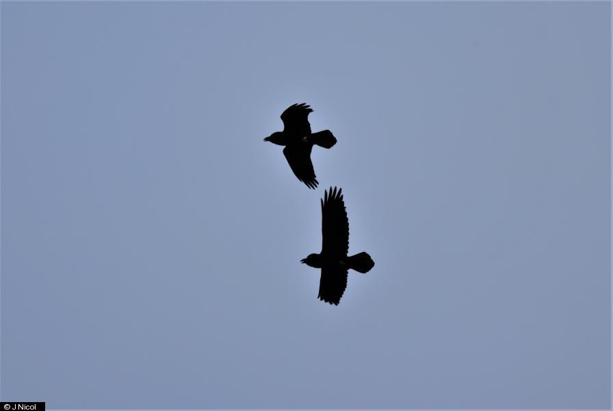 Raven - 1 - calling loudly over main lake whilst being mobbed by 6 carrion crows.