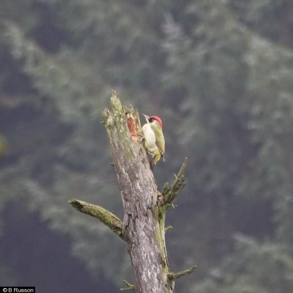 - 8 - Small flock feeding in trees, observed from bridge at base of Fairthorn Clough ; Kestrel - 1 ; Green Woodpecker - 1 - distant view in plantation