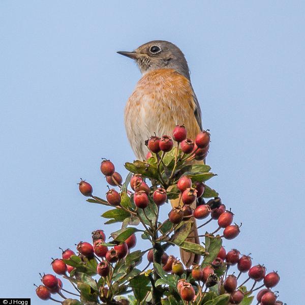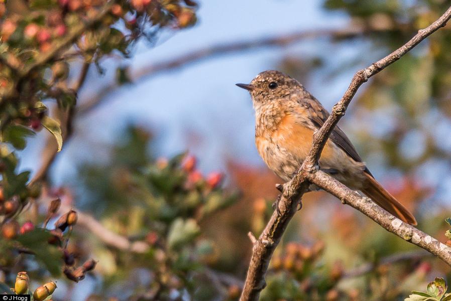 Dunnock - 1 ; Wren - 1 ; Stonechat - 5 - family party fly catching . ; Linnet - 57+ - 57 counted , many more calling in tree tops. ; Mistle Thrush - 13 - single group feeding in sheep fields. ; Great Spotted Woodpecker - 1 ; Kestrel - 1
