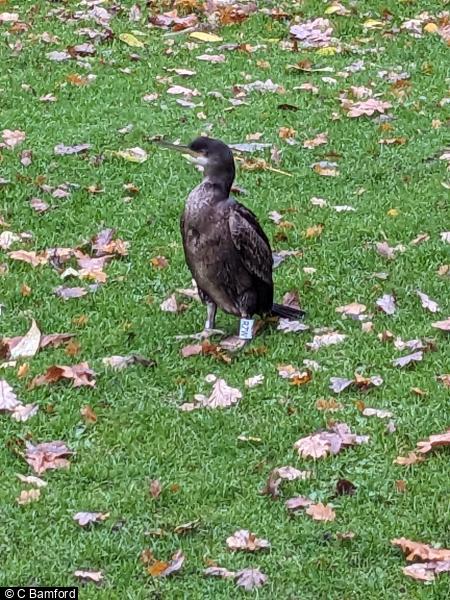 - 1 - CR individual RZW on the grass across the lake behind the University Library. Shuffled away towards the middle of the park when disturbed by a passing park vehicle [unwell?]